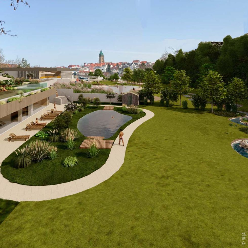 Planung der Freianlagen, 500 m² Naturschwimmbad, Wasserspielplatz, Saunagarten, Gewässerrenaturierung