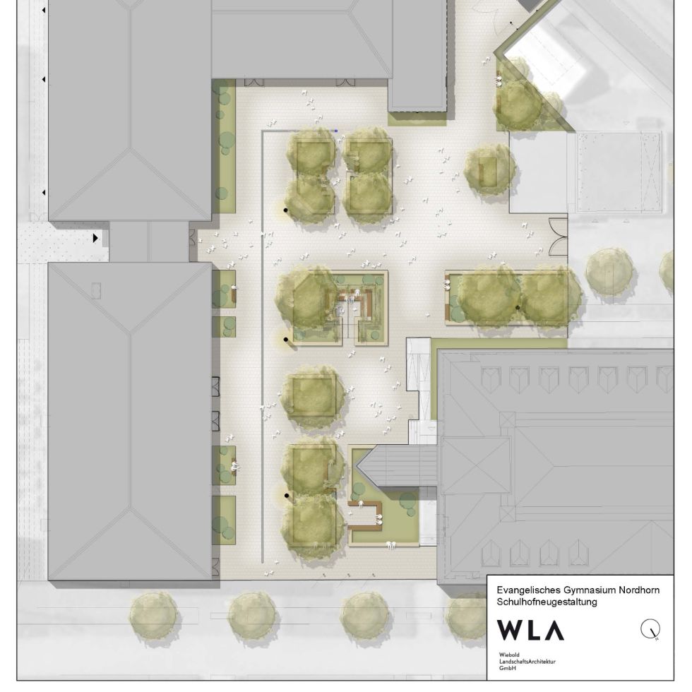 Die vorhandene Schulhoffläche zwischen Altbau und den Neubauten des Evangelischen Gymnasiums wurde ursprünglich als Parkplatz konzipiert, was nach wie vor deutlich zu erkennen ist. Aufgrund großflächiger Bodenverdichtung gibt es kaum Vegetationsflächen auf der Schulhoffläche und die Bestandsbäume haben sich in den letzten 20 Jahren kaum entwickelt.