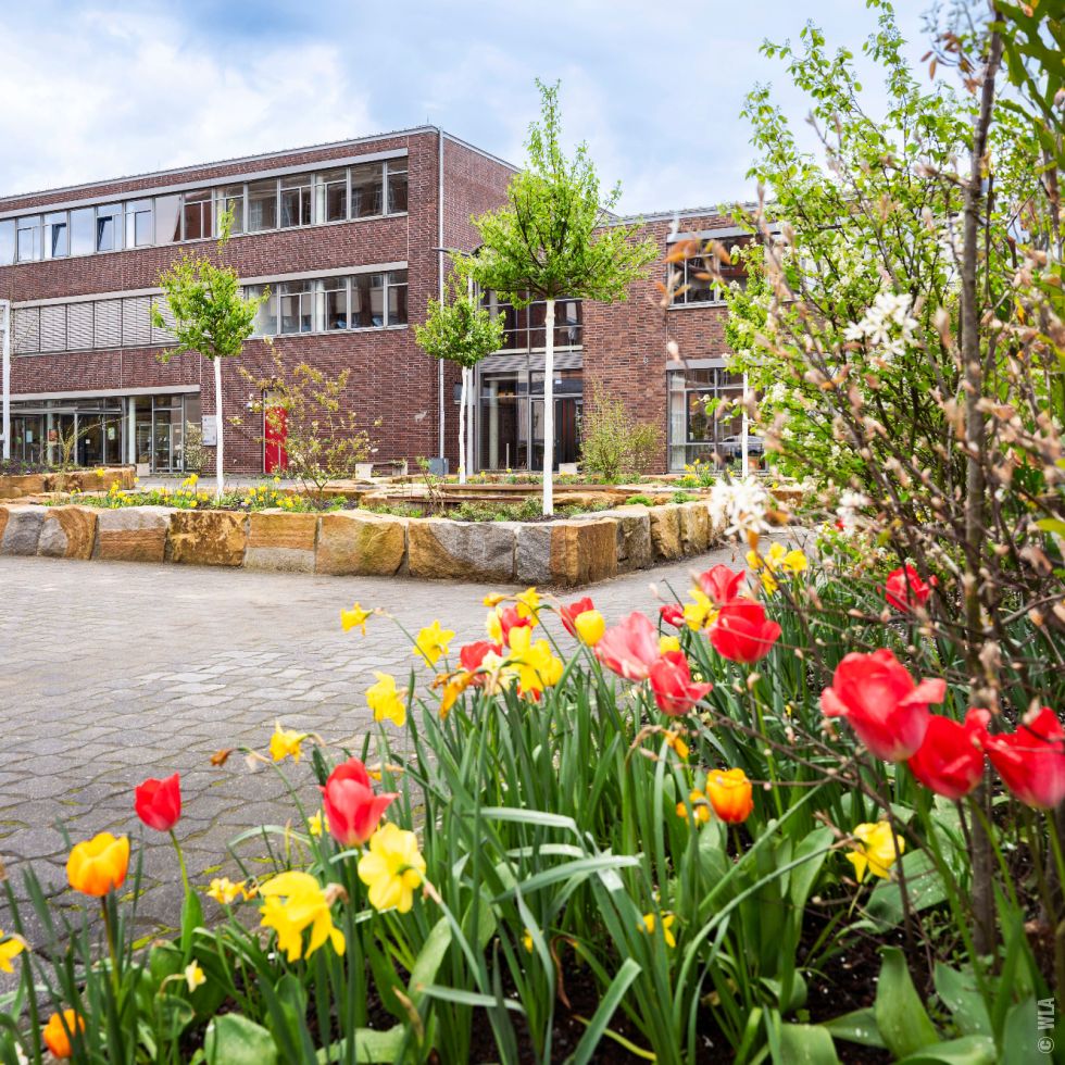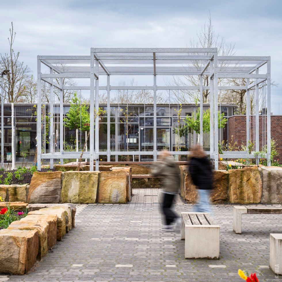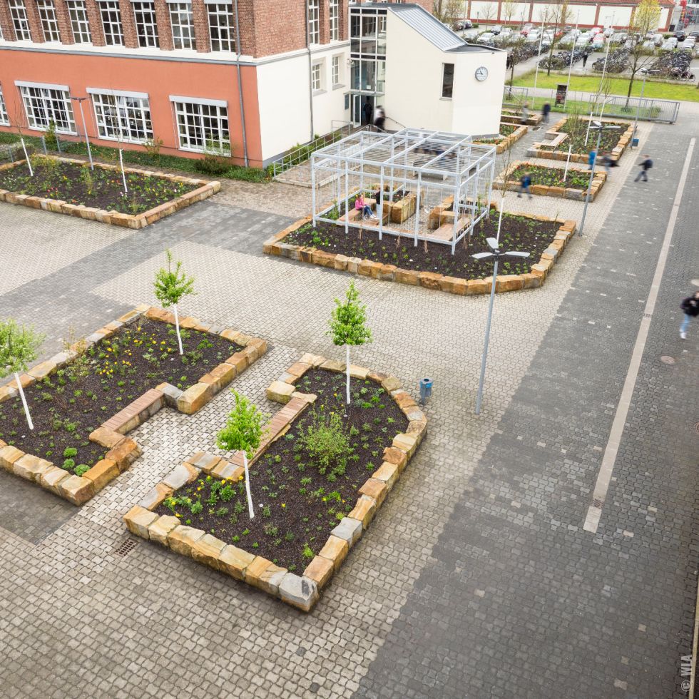 Für die Pflanzbeete werden große Flächen des Schulhofes entsiegelt und mit Natursteinmauern eingefasst, die gleichzeitig eine Funktion als Sitzmauern haben. An zentraler Stelle entsteht durch im Rechteck angeordnete Sitzstufen ein „grünes Klassenzimmer“, das zusätzlich durch eine Pergola überstellt wird.