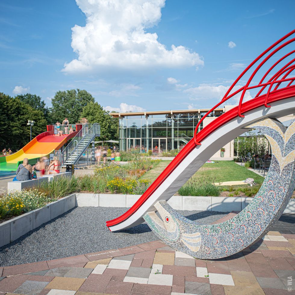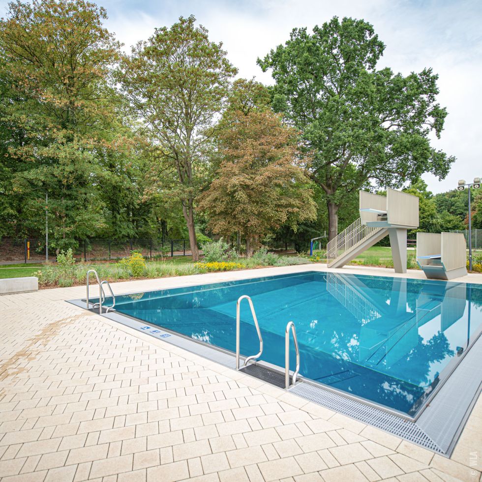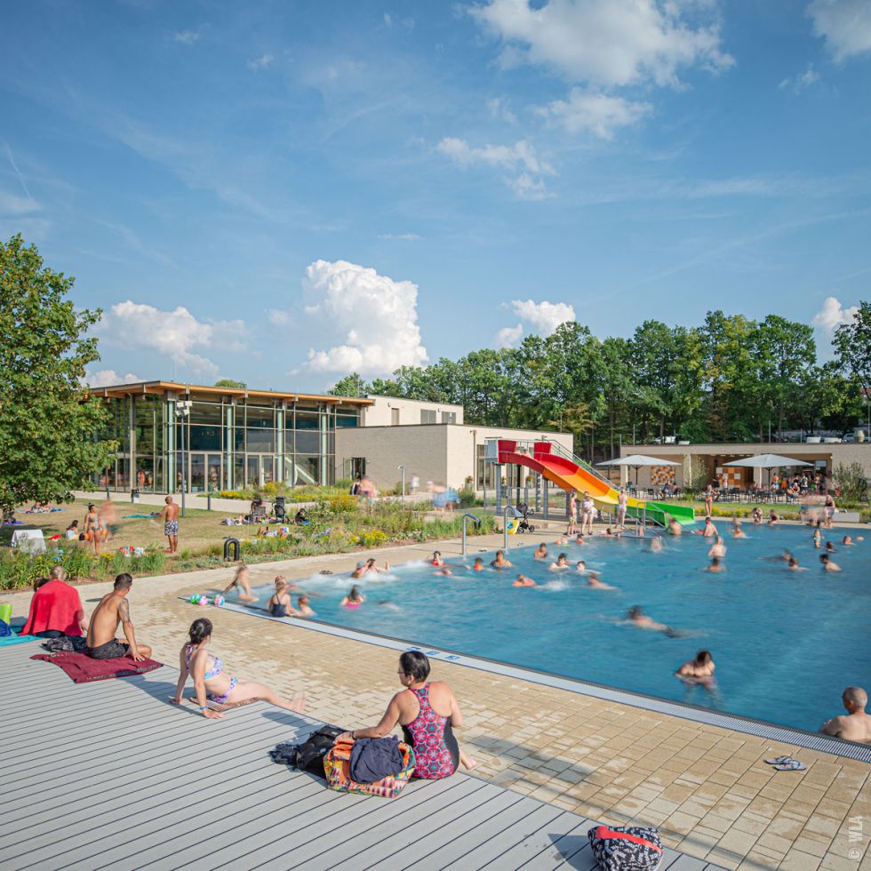 Das durch einen alten Baumbestand geprägte Freibadgeländewurde durchein neues Kleinkinderbecken und Spielbereiche ergänzt. Einheitlich gestaltete Beckenumgänge und Terrassenflächen schaffen die gestalterische Verbindung zwischen Gebäuden und Freibad. Im Norden des Schwimmerbeckens wurde eine Liegetribüne angelegt. Um das Kleinkinderbecken entstanden durch Hecken eingefasste Liegeterrassen, die einen geschützten Aufenthalt in direkter Nähe zu den Spielflächen ermöglichen. Die an die Beckenumgänge angrenzenden Pflanz- und Rasenflächen wurden erneuert und mit einer pflegeleichten Mischpflanzung aus Gräsern und Blütenstauden ergänzt.