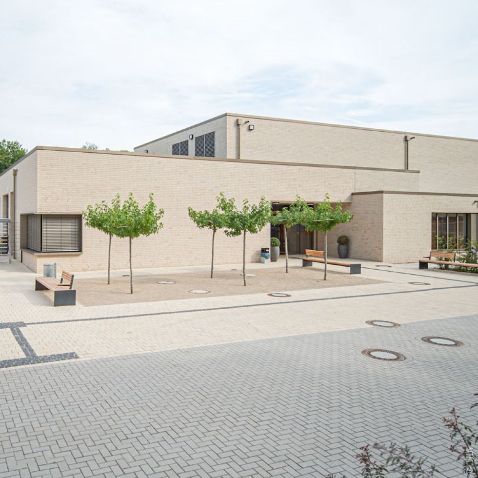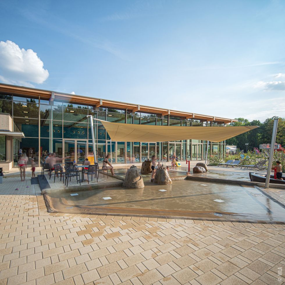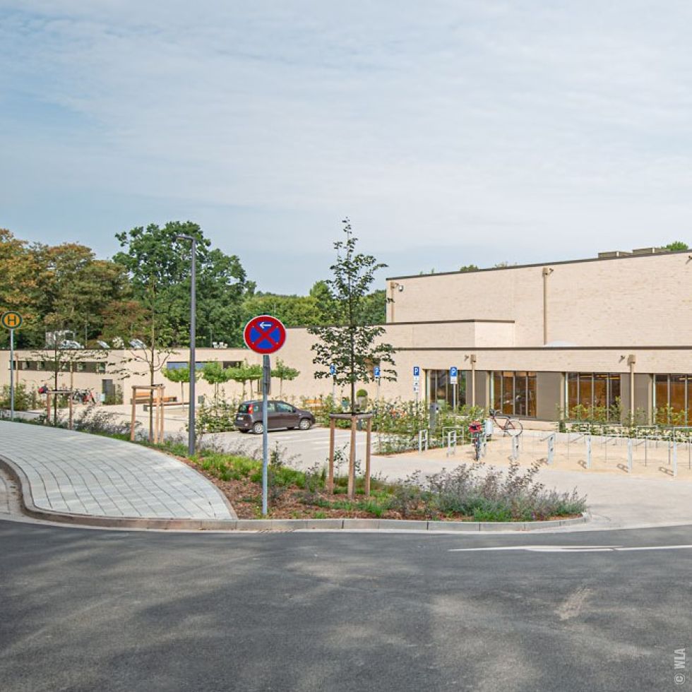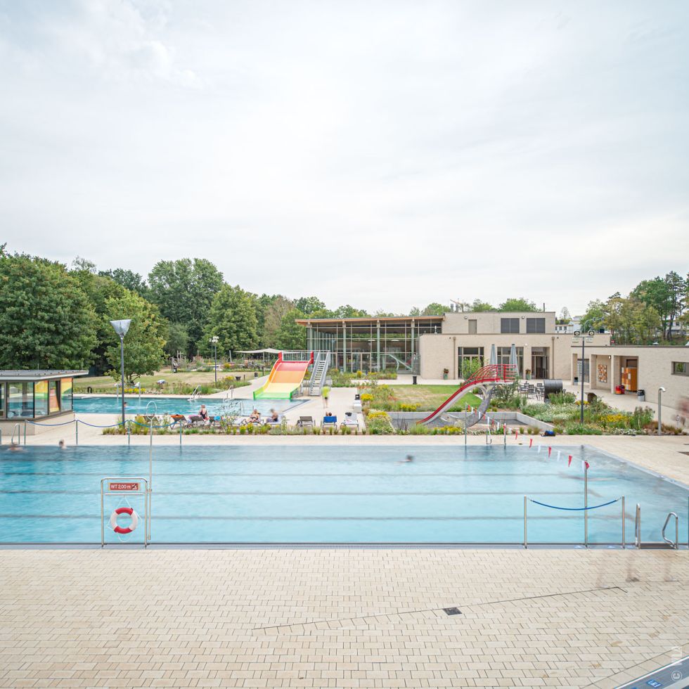 Unterhalb der Bushaltestelle erstreckt sich das Gebäude des Hallenbades im Westen schließen sich der Eingangsbereich des Freibades mit Umkleide- und Technikgebäude an. Vor dem Hallenbad wurde ein Vorplatz mit dachförmig geschnittenen Platanen angelegt. Außerdem wurden entlang der Gebäude Fahrradstellplätze und barrierefreie PKW-Stellplätze errichtet. Eingangsbereiche und Gebäude bildend das Rückgrat für das anschließende, weitläufige Freibadgelände.