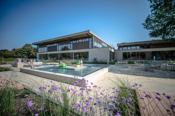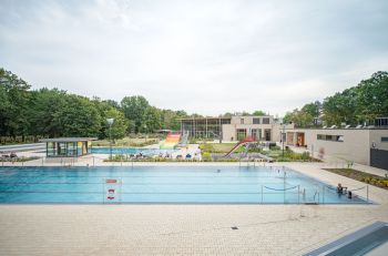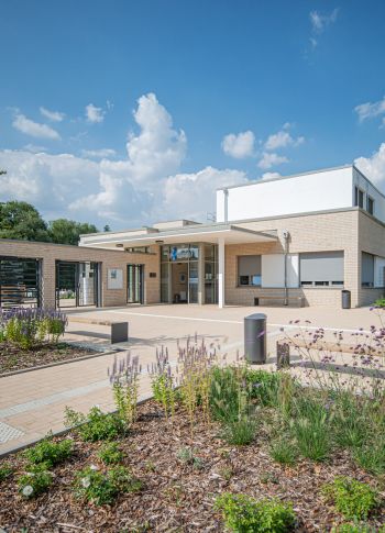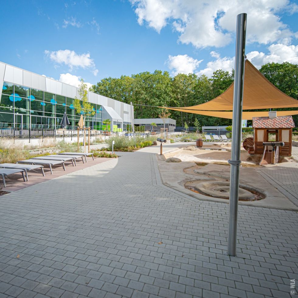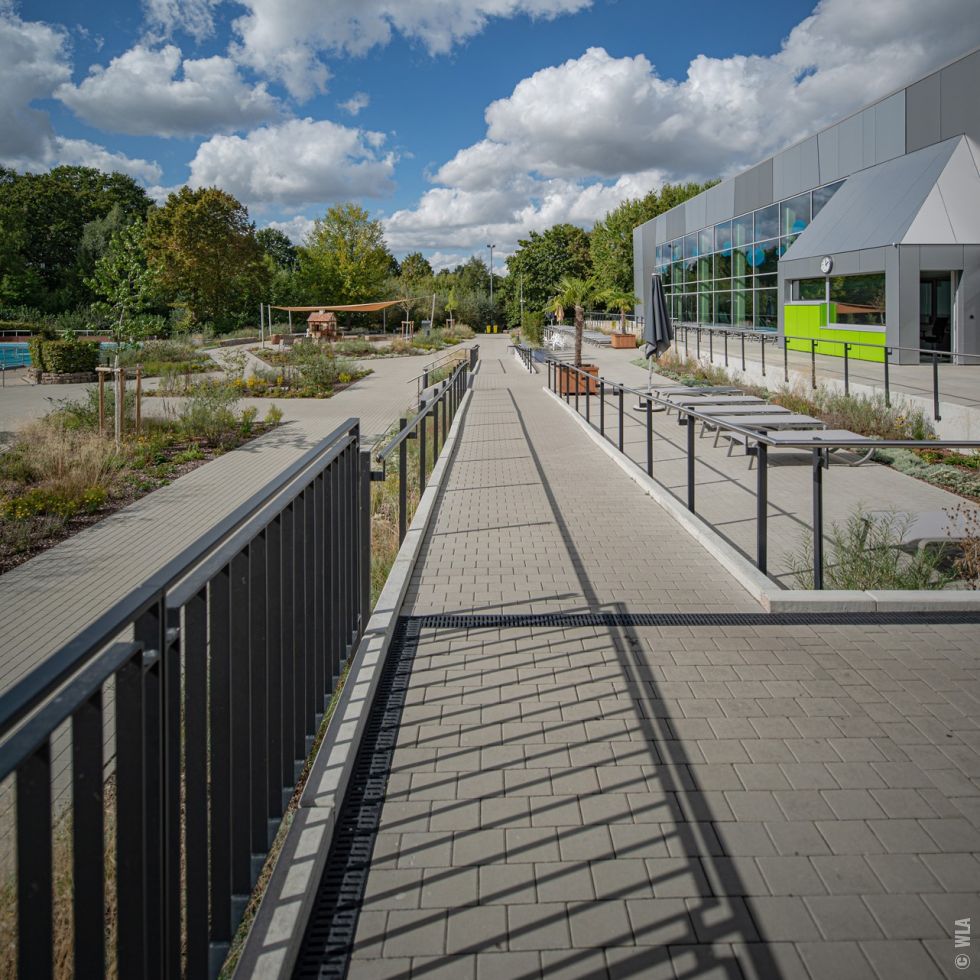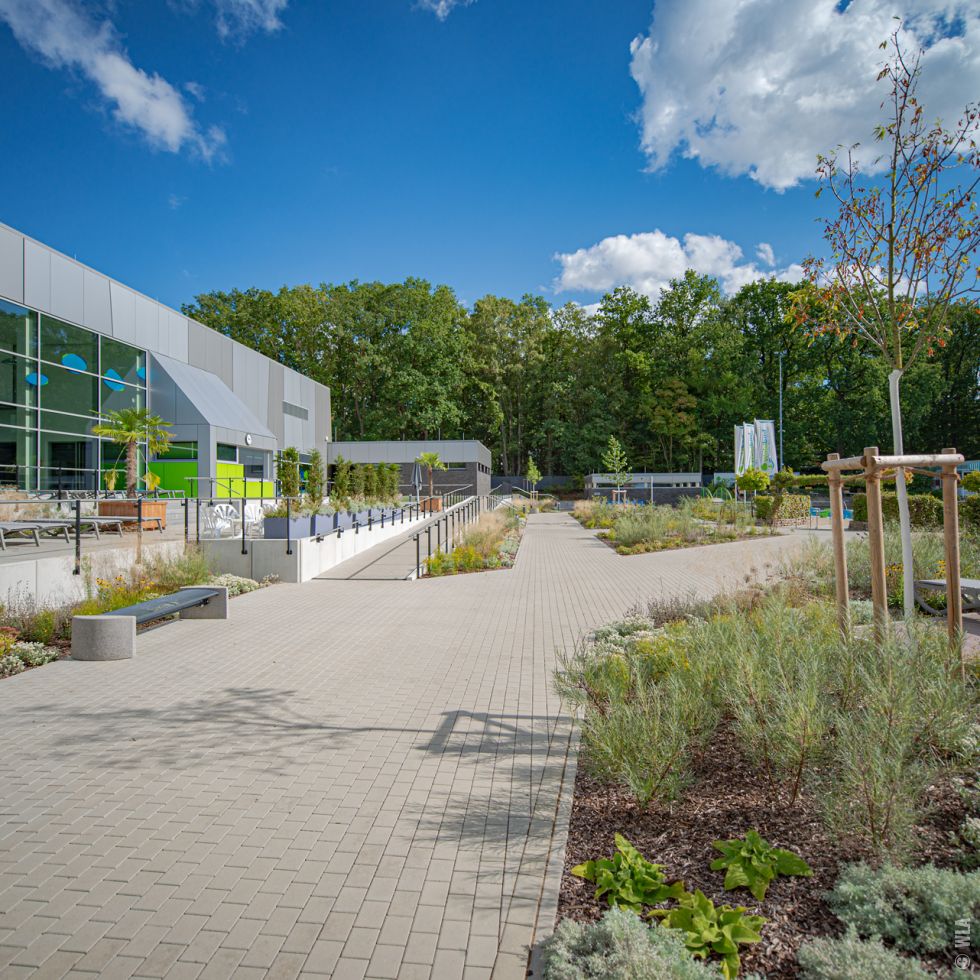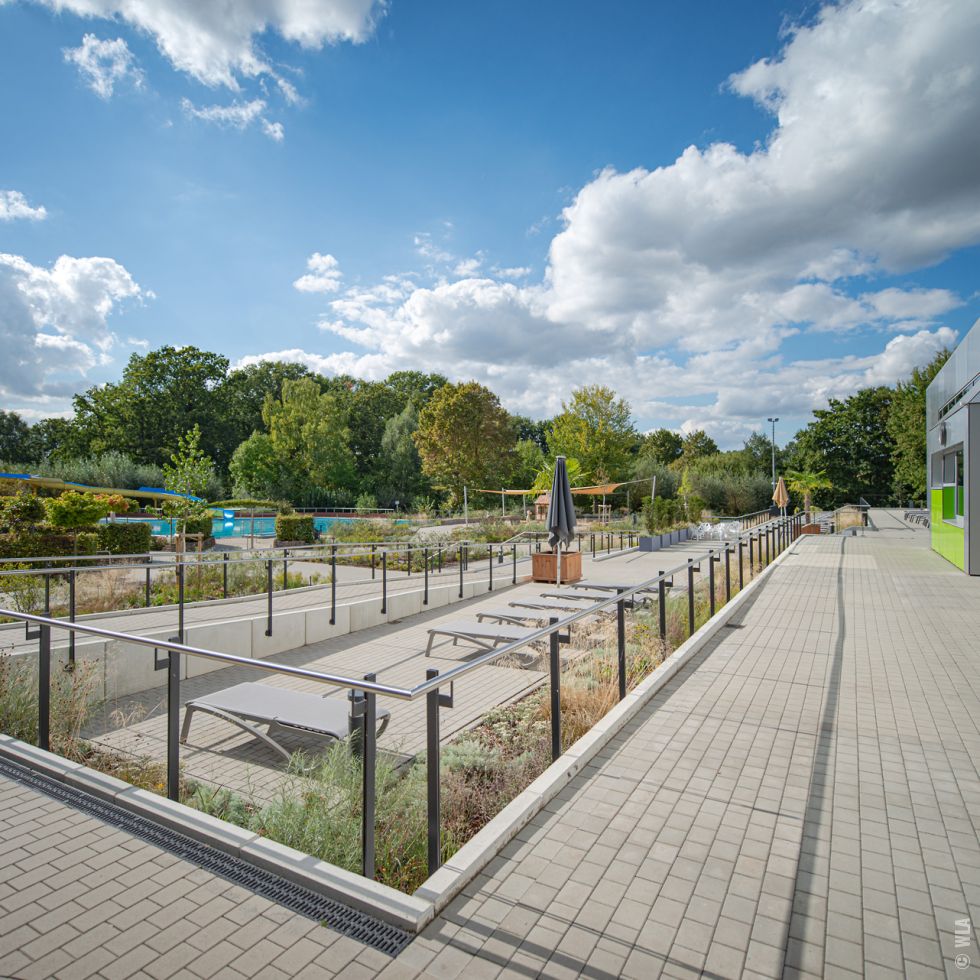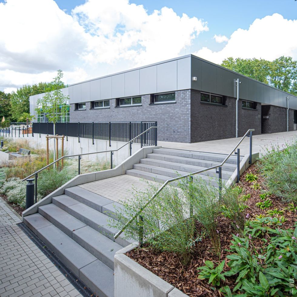 Auf dem Gelände des Waldbades in Emsdetten wurde zur Ergänzung des reinen Freibades ein neues Hallenbad errichtet. Das durch Krieger Architekten geplante Hallenbad wurde auf einem mittleren Geländeniveau zwischen der Blumenstraße und der Badeplatte des Freibades errichtet. Die besondere Herausforderung lag in der Überwindung und barrierefreien Erschließung des Bades und Freibades über einen etwa 3,50 m großen Höhenunterschied zwischen Straße und Freibad. Das Gelände ist durch einen alten Baumbestand aus Eichen und Ahornarten gekennzeichnet, die während der Baumaßnahme entsprechend zu schützen waren und der in weiten Teilen erhalten werden konnte. Die Erschließung von der Blumenstraße aus, erfolgt über eine großzügige, barrierefreie Rampe und verschiedene Treppenanlagen, über die man die auf Straßenniveau gelegenen Fahrradstellplätze erreicht. Vor dem Eingang des Bades entstand durch die Terrassierung des Bestandsgelände eine kleine Aufenthaltsfläche mit Sitzgelegenheit. Über eine benachbarte steilere Rampe erfolgt an dieser Stelle auch die Erschließung des Wirtschaftshofes. Das Freibad wurde durch ein neues Kleinkinderbecken aus Modellierbeton ergänzt, das mit einem Mühlenhäuschen, verschiedenen Wasserrinnen, Stauwehren und Spritzattraktionen thematisch an den das Gelände durchfließenden und begrenzenden Mühlenbach erinnert. Ein Matschspielplatz und Wippschafe ergänzen das Spielangebot. Die großzügigen Sonnenterrassen zwischen Hallenbad und Freibad erlauben eine saisonverlängernde Nutzung des Außenraumes. Eine artenreiche den jeweiligen Standortbedingungen angepasste Staudenpflanzung ergänzt das Gesamtbild und bietet rund um das Jahr neue Blütenaspekte. |