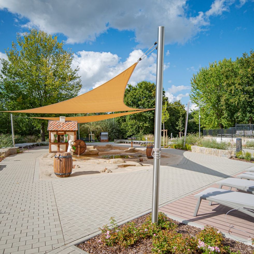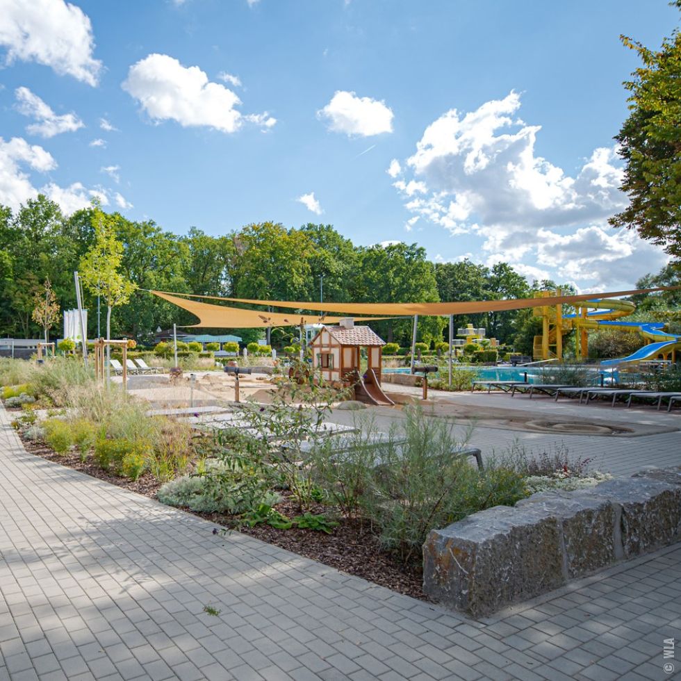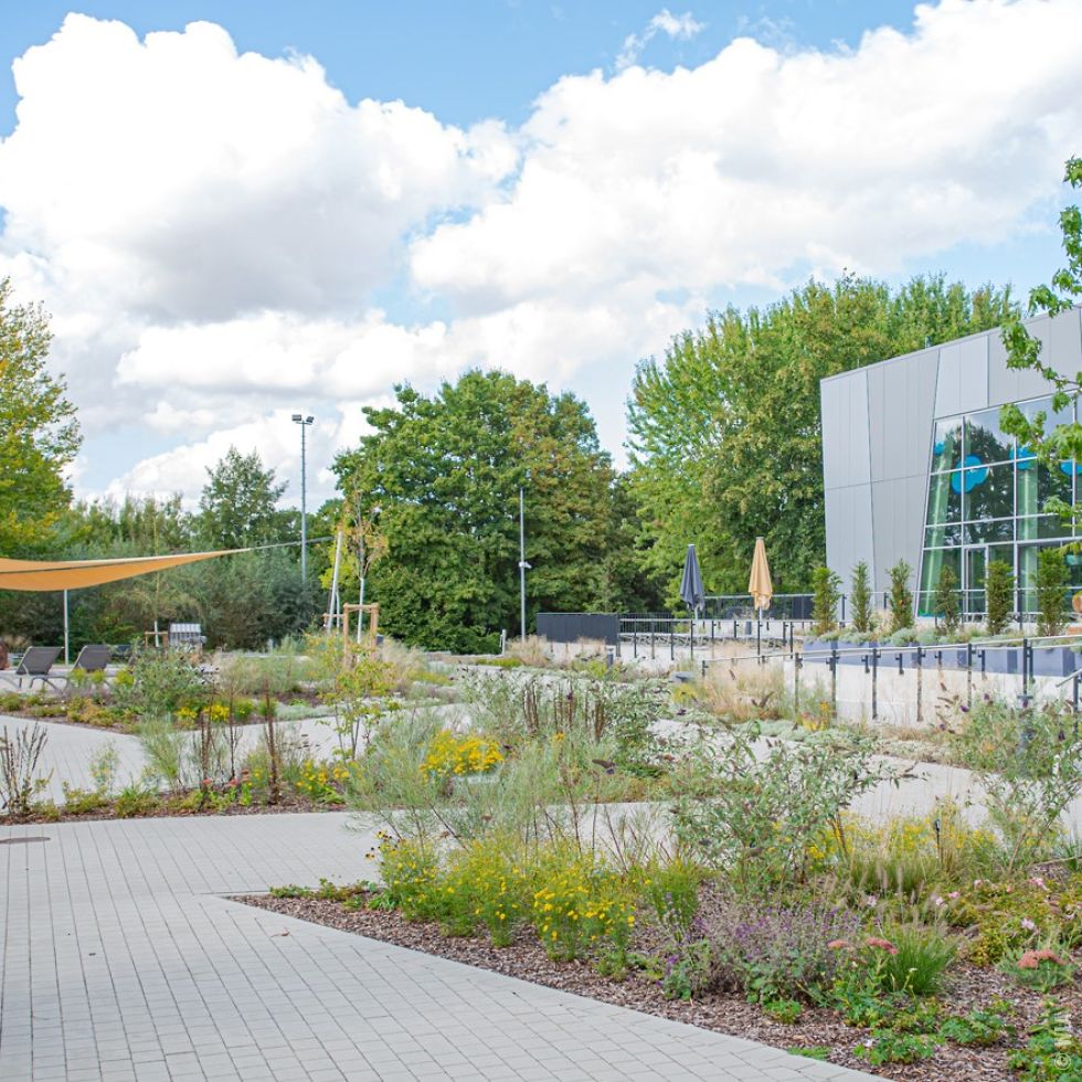 Planung der Freianlagen: barrierefreie Erschließung, Wirtschaftszufahrten, Terrassenflächen, Fahrradstellplätze, Matschspielplatz, Kinderaußenbecken, Bepflanzung